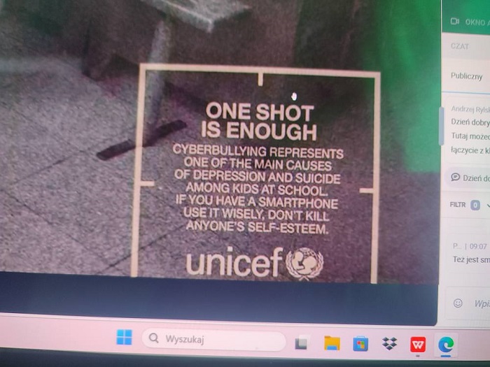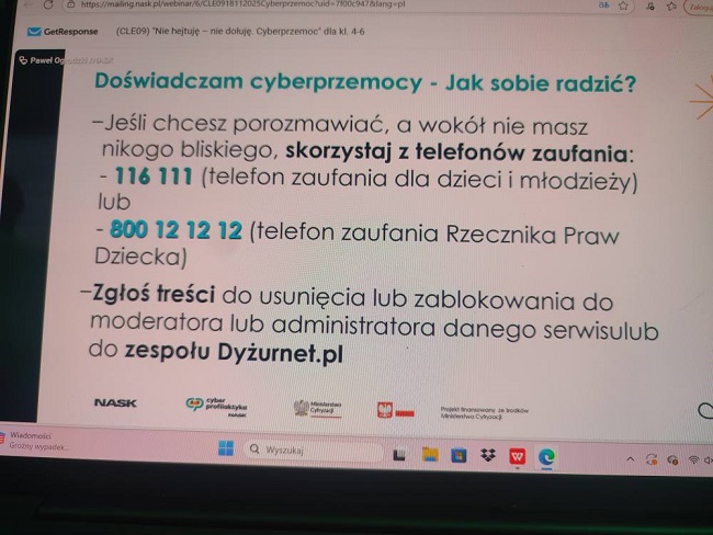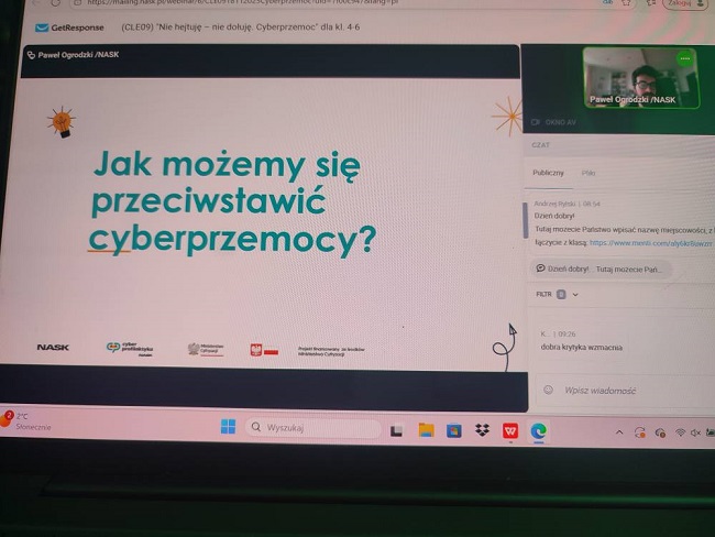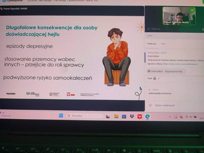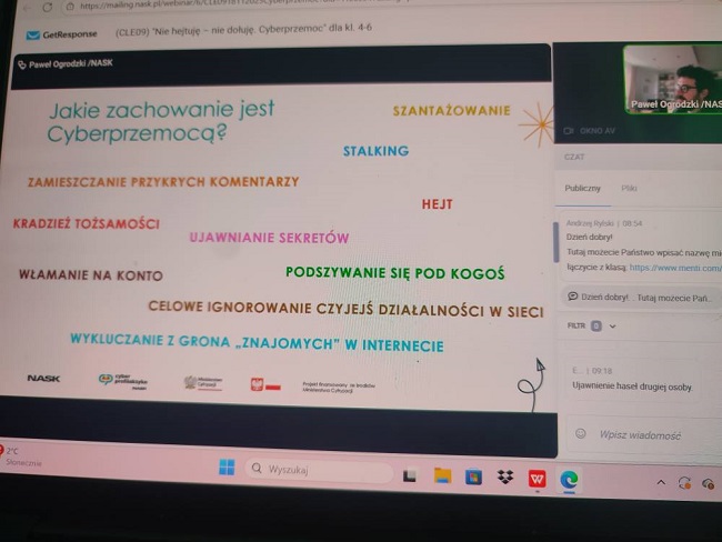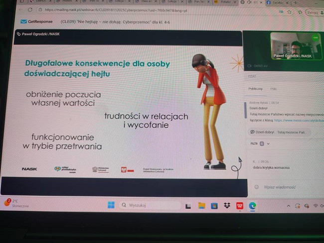 Podczas webinaru poruszono tematy związane z hejtem, odpowiedzialnym korzystaniem z Internetu oraz sposobami reagowania na przemoc online. Uczniowie zdobyli praktyczną wiedzę, która pomoże im bezpiecznie poruszać się w cyfrowym świecie i budować kulturę szacunku w sieci.