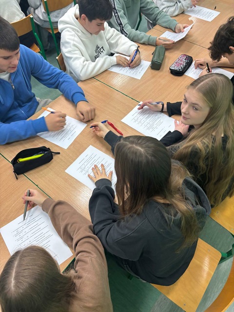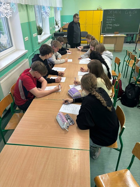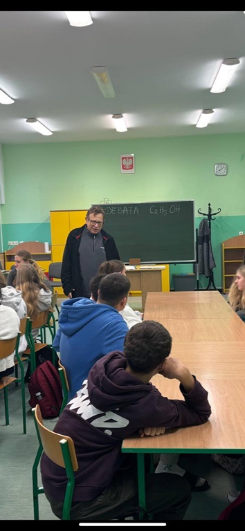 Wydarzenie zgromadziło wszystkie klasy ósme, a młodzież z dużym zaangażowaniem włączała się w rozmowę. Pod kierunkiem prowadzącej debaty ósmoklasiści analizowali konsekwencje zdrowotne, społeczne i emocjonalne wynikające ze spożywania alkoholu. Zastanawiali się również, jaką rolę alkohol pełni w XXI wieku, w jaki sposób jest obecny w kulturze, reklamie i mediach oraz jak może to wpływać na młode osoby stojące przed ważnymi wyborami.