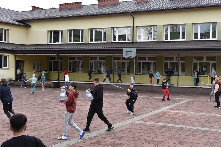 Korzystając z pięknej, słonecznej pogody, uczniowie wyszli na patio szkoły i zorganizowali wcześniejsze obchody lanego poniedziałku.