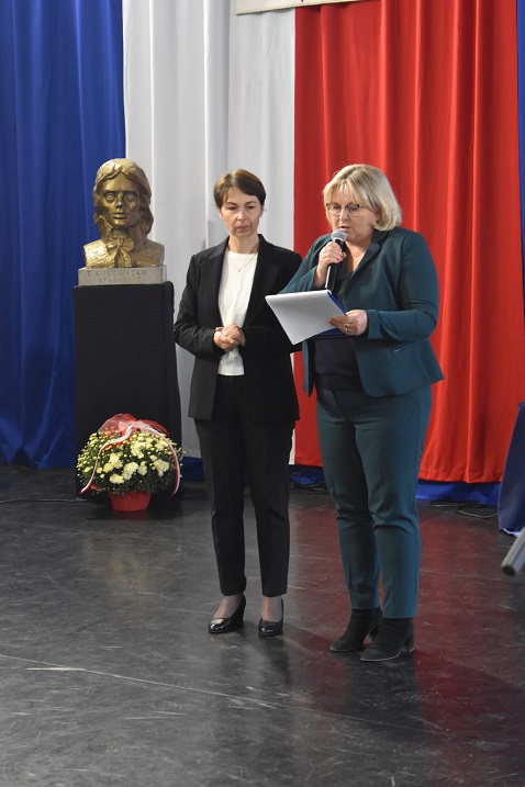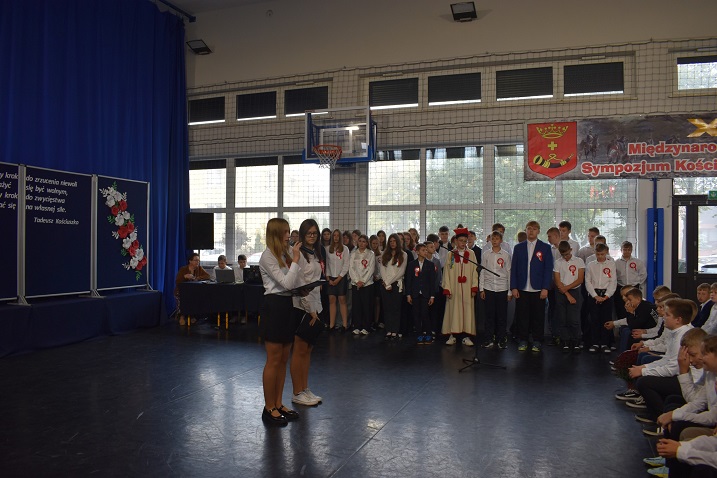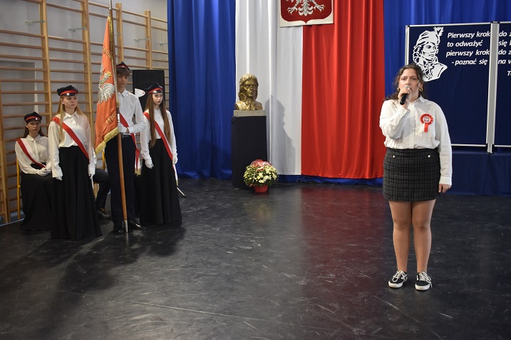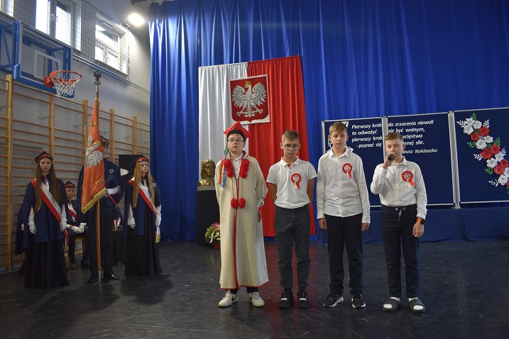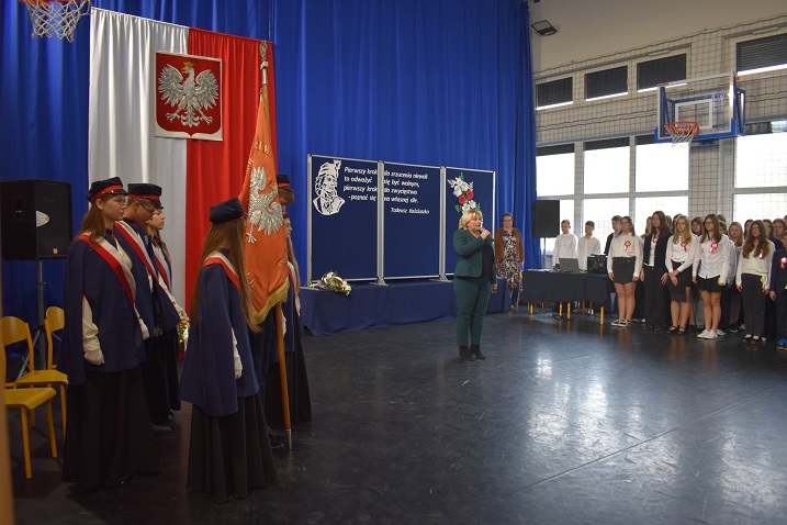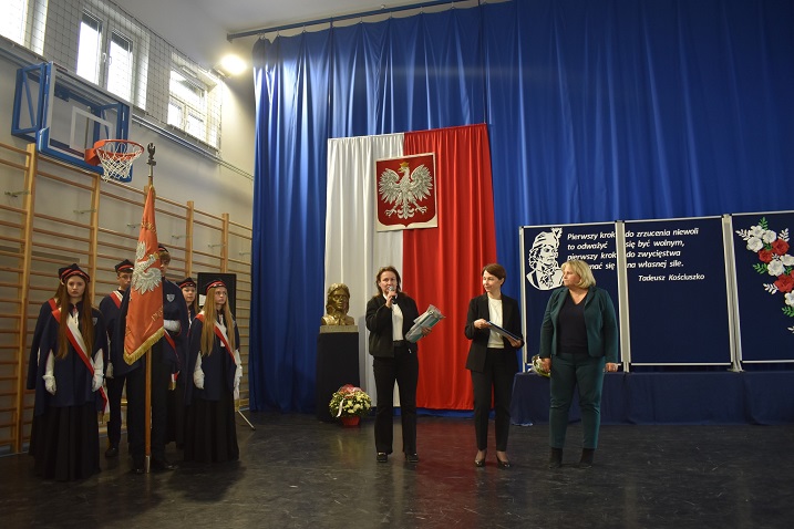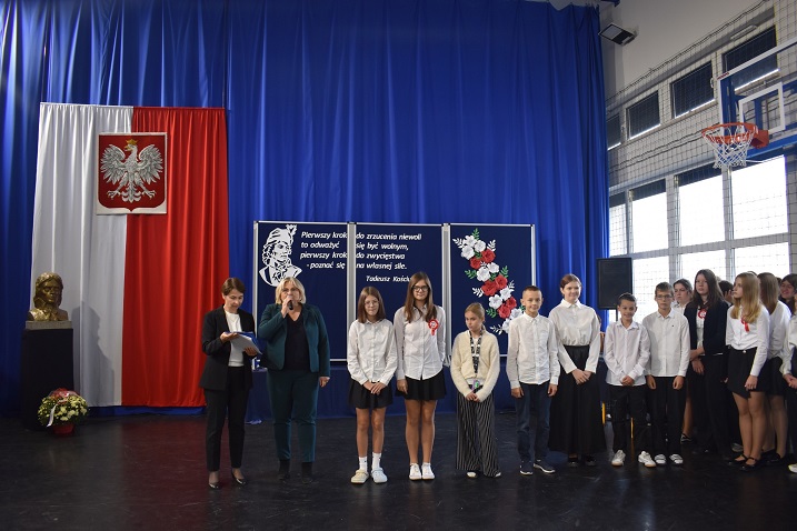 Uroczystość rozpoczęła Pani Dyrektor, witając zgromadzonych i przypominając postać naszego Patrona – Tadeusza Kościuszki, bohatera narodowego, który całe życie poświęcił walce o wolność ojczyzny.