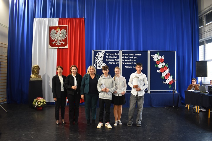 Pani Aneta Hacz wręczyła również nagrody uczniom klas Ic, VIa i VIIIa za najładniejszy plakat promujący przeciwdziałanie przemocy rówieśniczej. Zwycięzcy otrzymali bon dla swoich klas – dzień bez pytania oraz pamiątkowe linijki.