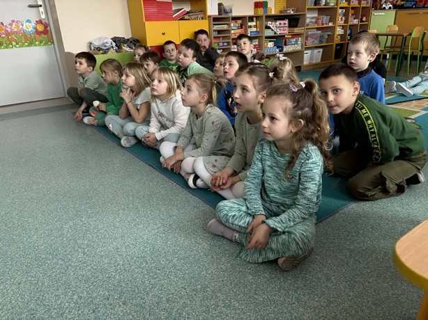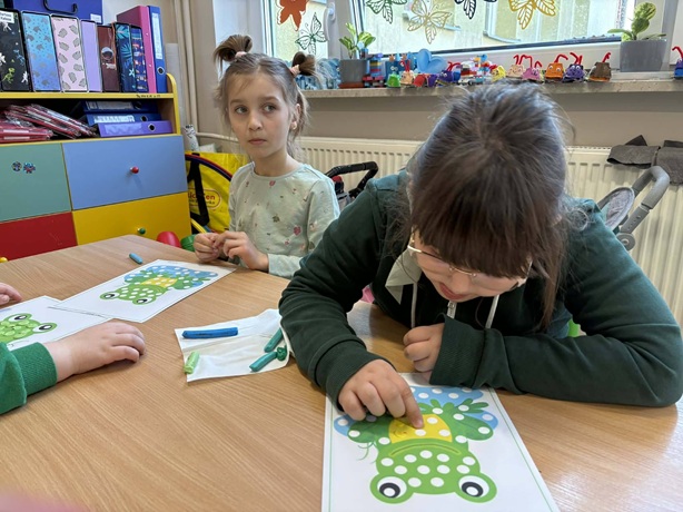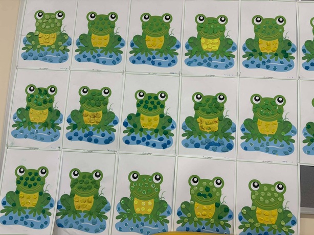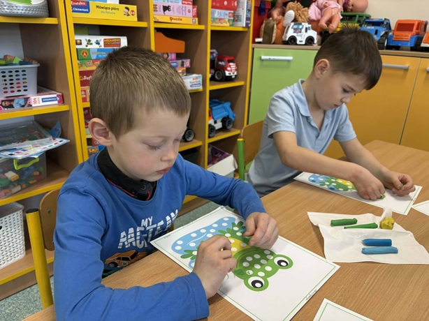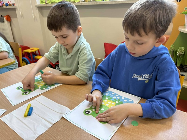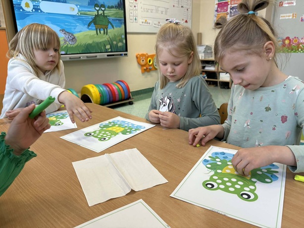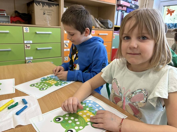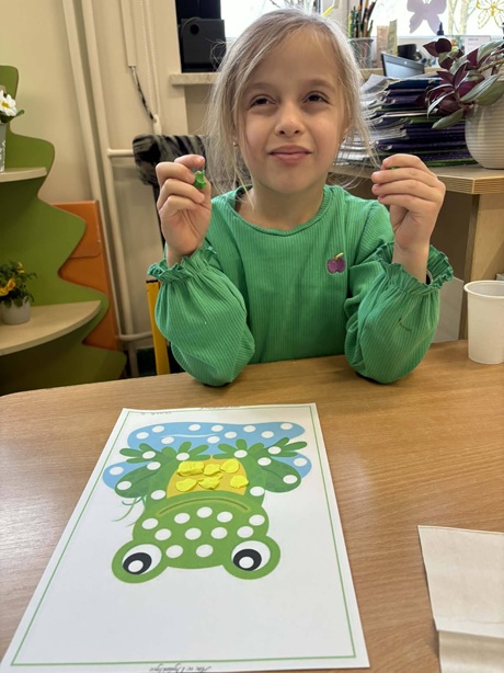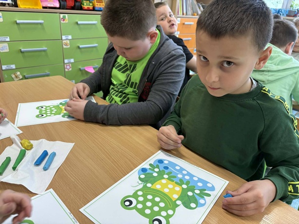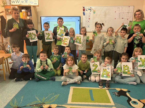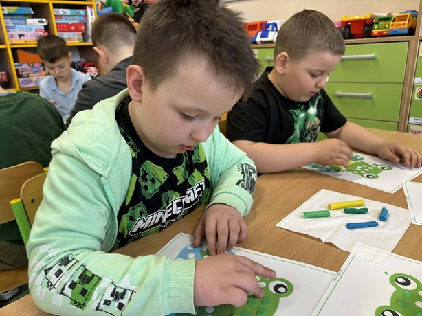Przedszkolaki z grupy BYSTRZAKI wraz z wychowawcą włączyły się w obchody przypadającego 20 marca Dnia Żaby. 19.03.2026r. dzieci po przywitaniu się rozwiązywały zagadki, oglądały obrazki przedstawiające żaby, a także bawiły się w Żabie zabawy. Wysłuchały opowiadanie B. Formy „Zielona żabka”. Dzieci wyjaśniły sobie znaczenie barwy ochronnej. Nie zabrakło również głoskowania, sylabizowania, określania głosek w nagłosie i wygłosie wyrazów. Podczas zajęć dzieci wykonały prace plastyczne zielone żabki oraz wylepienie białych plam plasteliną według wskazówek. Dzieci dowiedziały się różnych ciekawostek na temat życia żab.