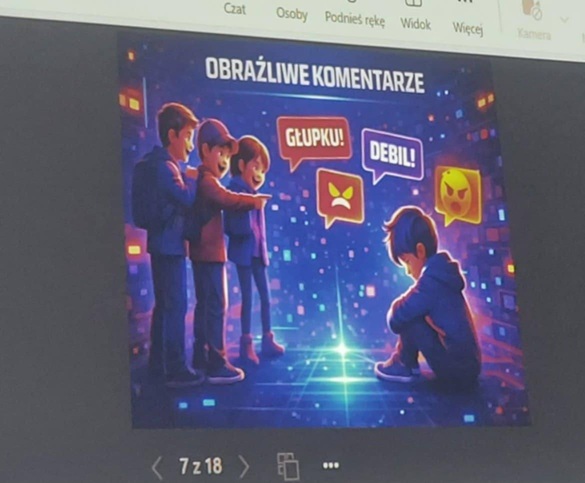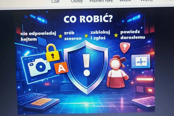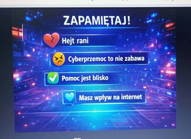 Podczas spotkania uczniowie dowiedzieli się, czym jest hejt i cyberprzemoc, jak reagować w trudnych sytuacjach w internecie oraz gdzie szukać pomocy. Była to cenna lekcja odpowiedzialnego i bezpiecznego korzystania z sieci.