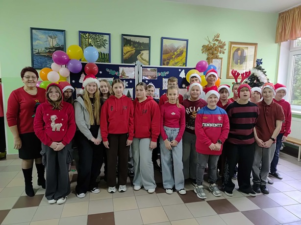 W naszej szkole od samego rana panowała wyjątkowa, świąteczna atmosfera. Po korytarzach przechadzał się Mikołaj w czerwonym stroju, a jego pomocnicy rozdawali uczniom słodkie upominki. Wielu uczniów przyszło w czerwonych czapkach lub świątecznych strojach, co sprawiło, że dzień stał się jeszcze bardziej radosny i kolorowy.