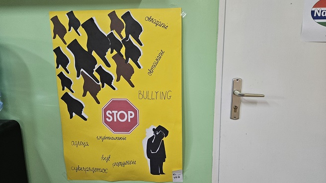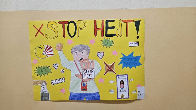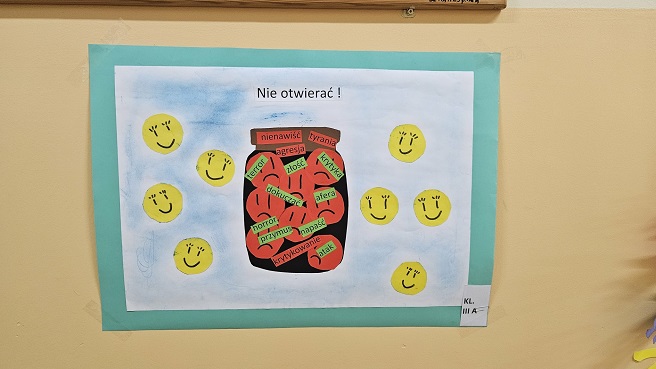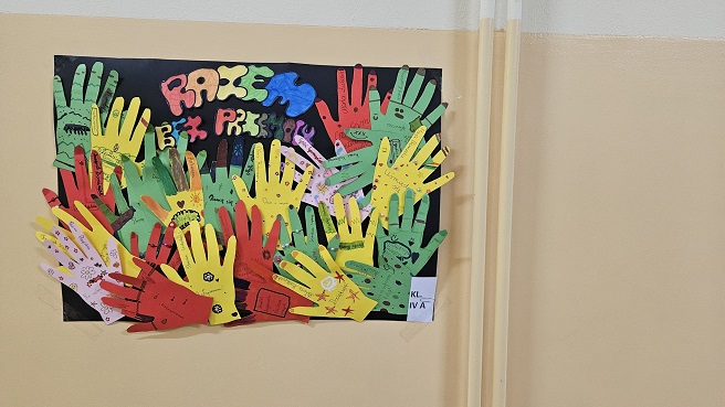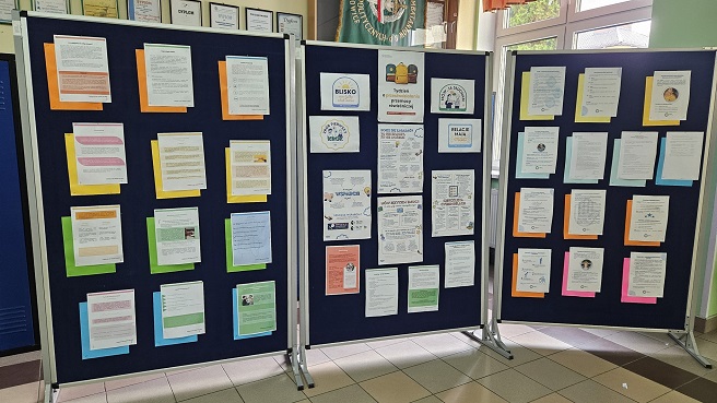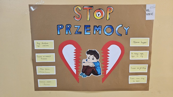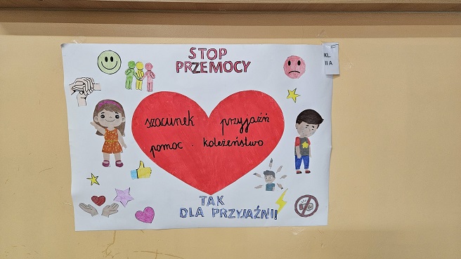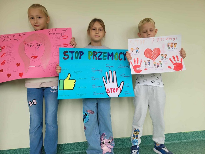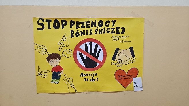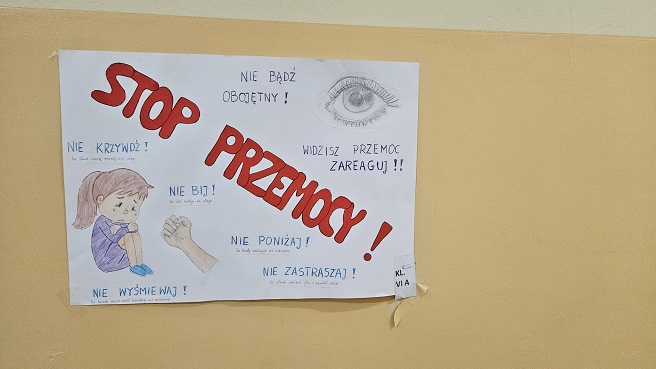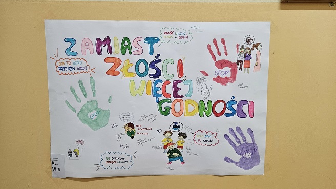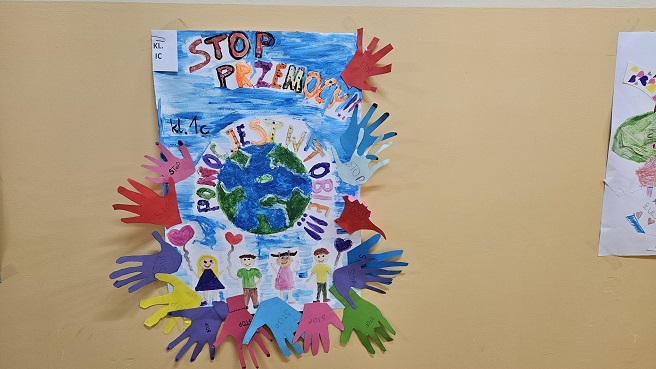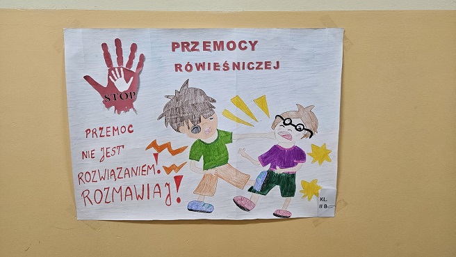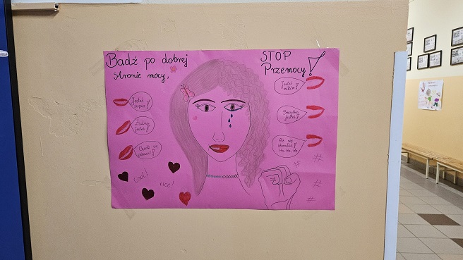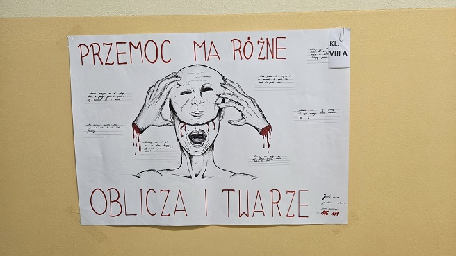 Uczniowie przygotowali plakaty konkursowe pod hasłem „Przeciwdziałanie Przemocy Rówieśniczej”. Z tych prac powstała piękna wystawa szkolna, dzięki której każdy mógł zobaczyć zaangażowanie młodzieży.