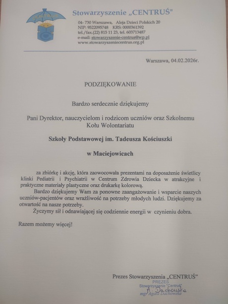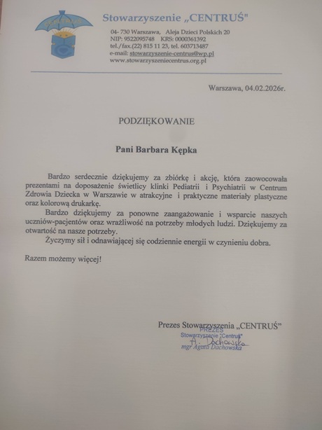 Z ogromną radością informujemy, że otrzymaliśmy podziękowanie od Stowarzyszenie „CENTRUŚ” za udział naszej społeczności w akcji charytatywnej na rzecz doposażenia świetlicy Kliniki Pediatrii i Psychiatrii w Centrum Zdrowia Dziecka w Warszawie.
