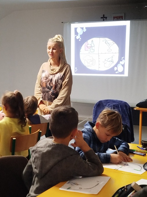 Podczas zajęć przybliżono uczniom podstawowe informacje dotyczące środków uzależniających oraz zagrożeń z nimi związanych. Kształtowano również umiejętności dbania o własne bezpieczeństwo w relacjach z innymi.